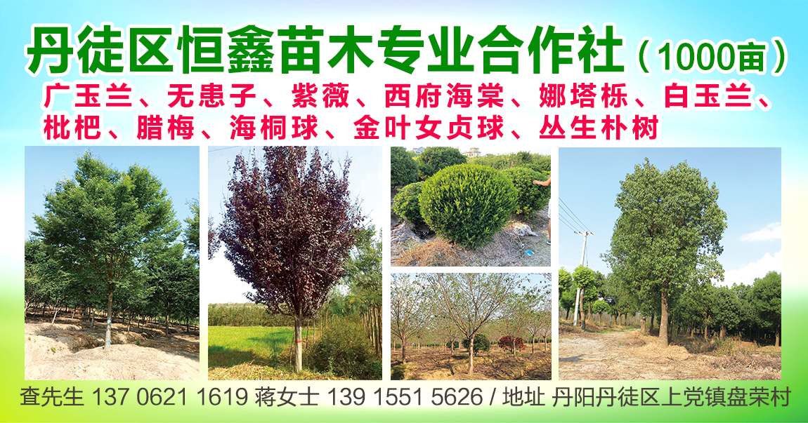 丹阳市丹徒区恒鑫苗木合作社基地位于丹徒区上党镇盘荣村,苗圃面积1000亩主营早樱、晚樱、高杆樱花、香樟、榉树、栾树、白玉兰、青枫、红叶李、红叶石楠球、朴树等各种乔木和灌木。
